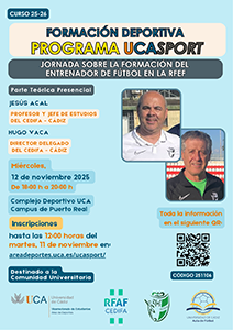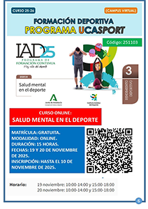 XII Curso UCASport Diversidad Funcional y Medio AcuáticoPlazo de inscripción: Finalizado“Arbitrar en fútbol sala” por Pedro Carrillo ArroyoPlazo de inscripción: FinalizadoXI Curso UCASport Diversidad Funcional y Medio AcuáticoPlazo de inscripción: FinalizadoX Curso UCASport Surf y Diversidad FuncionalPlazo de inscripción: finalizadoCurso de Entrenamiento Hipopresivo + Curso de Entrenamiento Suelo Pélvico. 4 y 5 de abril 2020Plazo de inscripción: finalizado.La entidad Movement&Wellness y la Universidad de Cádiz organizan un Curso de Entrenamiento Hipopresivo y Entrenamiento Suelo Pélvico los días 4 y 5 de abril de 2020 en las instalaciones de PILATES Y MAS (C/Ursulinas. Jerez de la Frontera), con una duración de 16 horas. Información en inscripciones: info@movewell.org Curso de Especialización en Pilates Suelo. 14 de Marzo a 5 de abril 2020Plazo de inscripción: finalizado.La entidad Movement&Wellness y la Universidad de Cádiz organizan un Curso de Especialización en Pilates Suelo desde el sábado, 14 de marzo, al domingo, 5 de abril de 2020 en las instalaciones de PILATES Y MAS (C/Ursulinas. Jerez de la Frontera), con una duración de 150 horas (presencial + online). Información en inscripciones: info@movewell.org Curso de Socorrismo Acuático + Primeros Auxilios + DESA. 17 de marzo de 2020Plazo de inscripción: finalizado.Curso en convenio con Cruz Roja. Se desarrollará del 17 de marzo al 24 de abril, de Lunes a Viernes de 9:00 a 15:00 horas, en las Instalaciones Deportivas UCA del campus de Jerez. La duración del curso teórico / práctico será 188 horas (135 presenciales y 50 a distancia). Inscripción, hasta el miércoles 11 de marzo en www.formacioncadiz.es. El precio del curso para la comunidad universitaria con Tarjeta Deportiva será de 288,15 €. El precio para el público en general es de 339 €. Curso incluido en el programa UCASPORT. Se podrá solicitar créditos ECTS según normativa. Descargar Cartel I Jornada “Mujer y Esgrima”. 17 de Diciembre de 2019Plazo de inscripción: finalizado.El Consejo Superior de Deportes, a través de su programa Mujer y Deporte, celebra el martes 17 de diciembre, de 11:30 a 13:00 horas, la I Jornada Mujer y Esgrima, en el Complejo Deportivo UCA de Puerto Real. Inscripciones hasta el viernes 13 de diciembre. Descargar Cartel Curso de Instructor Autonómico de Ajedrez FADA. 18, 20, 25 y 27 de Noviembre de 2019Plazo de inscripción: finalizado.La Federación Andaluza de Ajedrez (FADA), organiza un Curso Oficial para formar a Instructores de Ajedrez, a celebrarse en las instalaciones del Complejo Deportivo UCA de Puerto Real. Inscripciones hasta el jueves, 14 de noviembre, a través de la Federación: ajeduca@ajeduca.es. Descargar Cartel II Jornada de Psicología Mujer y Deporte. 15 Mayo 2019Plazo de inscripción: finalizado.El objetivo de esta Jornada es valorar la labor del profesional de la psicología del deporte en diferentes áreas de intervención relacionadas con la mujer deportista. Organizada por el Grupo de trabajo de Psicología del Deporte del Colegio Oficial de Psicología del Deporte de la Delegación de Cádiz, se celebrará en el Complejo Deportivo UCA de Puerto Real, el 15 de Mayo de 16:00 a 21:00 horas. Inscripciones hasta el 13 de Mayo de 2019. Descargar Cartel I Jornadas Náuticas UCA. 6, 13, 20 y 27 de Mayo de 2019Plazo de inscripción: finalizado.El Área de Deportes del Vicerrectoraro de Responsabilidad Social, Extensión Cultural y Servicios, en colaboración con el Vicerrectorado de Infraestructuras y Patrimonio, organiza las I Jornadas Náuticas UCA, a desarrollar en el Centro Náutico Elcano. Descargar Cartel Curso de Instructor Autonómico de Ajedrez FADA. (2ª Edición) 1, 8, 22 y 29 de Abril de 2019Plazo de inscripción: finalizado.La Federación Andaluza de Ajedrez (FADA), organiza un Curso Oficial para formar a Instructores de Ajedrez, a celebrarse en las instalaciones del Complejo Deportivo UCA de Puerto Real. Inscripciones hasta el viernes 29 de marzo a través de la Federación: ajeduca@ajeduca.es. Descargar Cartel Curso de Instructor Autonómico de Ajedrez FADA. 19, 26 de Marzo y 2, 9 de Abril de 2019Plazo de inscripción: finalizado.La Federación Andaluza de Ajedrez (FADA), organiza un Curso Oficial para formar a Instructores de Ajedrez, a celebrarse en las instalaciones del Complejo Deportivo UCA de Puerto Real. Inscripciones a través de la Federación: ajeduca@ajeduca.es. Descargar Cartel Jornadas de Introducción al Yoga. 7, 14, 21 y 28 Mayo 2018Plazo de inscripción finalizado.El propósito de estas jornadas es proporcionar a los alumnos los conocimientos y habilidades necesarias, con las técnicas básicas teórico-prácticas del Hatha Yoga, para que este sea capaz de realizar una práctica personal independiente que le permita mejorar su condición física general, energía, bienestar, y un enfoque consciente claro que le ayude en la realización de sus tareas físicas y mentales y en el conocimiento de sí mismo. Jornada de Psicología Mujer y Deporte. 7 Marzo 2018Plazo de inscripción finalizado.Los objetivos de esta jornada se centran en prestar atención en algunas áreas concretas de la actividad física, donde pueden describirse características peculiares y diferenciales del colectivo de las mujeres que practican deporte, tanto de forma de practicante base, aficionada o profesional. Descargar Cartel Curso de Especialización en Pilates Suelo. Noviembre 2017Plazo de inscripción finalizado.La entidad Movement&Wellness y la Universidad de Cádiz organizan un Curso de Especialización en Pilates Suelo desde el sábado, 4 de noviembre, al domingo, 17 de diciembre de 2017 en las instalaciones de PILATES Y MAS (C/Ursulinas. Jerez de la Frontera), con una duración de 150 horas (presencial + online). Descargar Cartel Curso de Entrenador y Monitor de Fútbol y Fútbol Sala. Octubre 2017Plazo de inscripción finalizado.La Federación Andaluza de Fútbol (FAF), el Centro de E