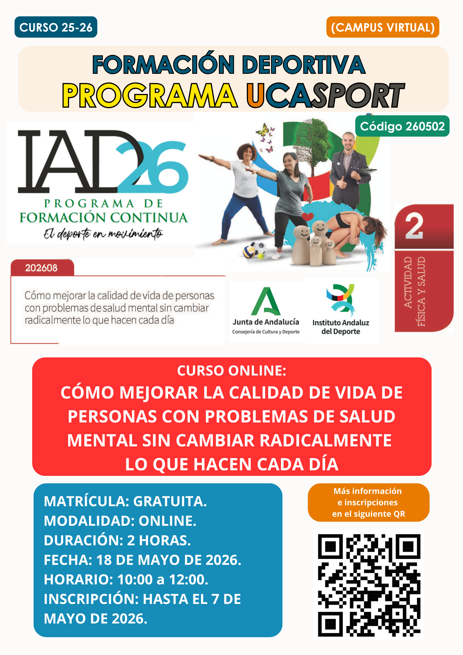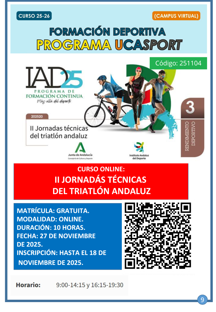 XII Curso UCASport Diversidad Funcional y Medio AcuáticoPlazo de inscripción: Finalizado“Arbitrar en fútbol sala” por Pedro Carrillo ArroyoPlazo de inscripción: FinalizadoXI Curso UCASport Diversidad Funcional y Medio AcuáticoPlazo de inscripción: FinalizadoX Curso UCASport Surf y Diversidad FuncionalPlazo de inscripción: finalizadoCurso de Entrenamiento Hipopresivo + Curso de Entrenamiento Suelo Pélvico. 4 y 5 de abril 2020Plazo de inscripción: finalizado.La entidad Movement&Wellness y la Universidad de Cádiz organizan un Curso de Entrenamiento Hipopresivo y Entrenamiento Suelo Pélvico los días 4 y 5 de abril de 2020 en las instalaciones de PILATES Y MAS (C/Ursulinas. Jerez de la Frontera), con una duración de 16 horas. Información en inscripciones: info@movewell.org Curso de Especialización en Pilates Suelo. 14 de Marzo a 5 de abril 2020Plazo de inscripción: finalizado.La entidad Movement&Wellness y la Universidad de Cádiz organizan un Curso de Especialización en Pilates Suelo desde el sábado, 14 de marzo, al domingo, 5 de abril de 2020 en las instalaciones de PILATES Y MAS (C/Ursulinas. Jerez de la Frontera), con una duración de 150 horas (presencial + online). Información en inscripciones: info@movewell.org Curso de Socorrismo Acuático + Primeros Auxilios + DESA. 17 de marzo de 2020Plazo de inscripción: finalizado.Curso en convenio con Cruz Roja. Se desarrollará del 17 de marzo al 24 de abril, de Lunes a Viernes de 9:00 a 15:00 horas, en las Instalaciones Deportivas UCA del campus de Jerez. La duración del curso teórico / práctico será 188 horas (135 presenciales y 50 a distancia). Inscripción, hasta el miércoles 11 de marzo en www.formacioncadiz.es. El precio del curso para la comunidad universitaria con Tarjeta Deportiva será de 288,15 €. El precio para el público en general es de 339 €. Curso incluido en el programa UCASPORT. Se podrá solicitar créditos ECTS según normativa. Descargar Cartel I Jornada “Mujer y Esgrima”. 17 de Diciembre de 2019Plazo de inscripción: finalizado.El Consejo Superior de Deportes, a través de su programa Mujer y Deporte, celebra el martes 17 de diciembre, de 11:30 a 13:00 horas, la I Jornada Mujer y Esgrima, en el Complejo Deportivo UCA de Puerto Real. Inscripciones hasta el viernes 13 de diciembre. Descargar Cartel Curso de Instructor Autonómico de Ajedrez FADA. 18, 20, 25 y 27 de Noviembre de 2019Plazo de inscripción: finalizado.La Federación Andaluza de Ajedrez (FADA), organiza un Curso Oficial para formar a Instructores de Ajedrez, a celebrarse en las instalaciones del Complejo Deportivo UCA de Puerto Real. Inscripciones hasta el jueves, 14 de noviembre, a través de la Federación: ajeduca@ajeduca.es. Descargar Cartel II Jornada de Psicología Mujer y Deporte. 15 Mayo 2019Plazo de inscripción: finalizado.El objetivo de esta Jornada es valorar la labor del profesional de la psicología del deporte en diferentes áreas de intervención relacionadas con la mujer deportista. Organizada por el Grupo de trabajo de Psicología del Deporte del Colegio Oficial de Psicología del Deporte de la Delegación de Cádiz, se celebrará en el Complejo Deportivo UCA de Puerto Real, el 15 de Mayo de 16:00 a 21:00 horas. Inscripciones hasta el 13 de Mayo de 2019. Descargar Cartel I Jornadas Náuticas UCA. 6, 13, 20 y 27 de Mayo de 2019Plazo de inscripción: finalizado.El Área de Deportes del Vicerrectoraro de Responsabilidad Social, Extensión Cultural y Servicios, en colaboración con el Vicerrectorado de Infraestructuras y Patrimonio, organiza las I Jornadas Náuticas UCA, a desarrollar en el Centro Náutico Elcano. Descargar Cartel Curso de Instructor Autonómico de Ajedrez FADA. (2ª Edición) 1, 8, 22 y 29 de Abril de 2019Plazo de inscripción: finalizado.La Federación Andaluza de Ajedrez (FADA), organiza un Curso Oficial para formar a Instructores de Ajedrez, a celebrarse en las instalaciones del Complejo Deportivo UCA de Puerto Real. Inscripciones hasta el viernes 29 de marzo a través de la Federación: ajeduca@ajeduca.es. Descargar Cartel Curso de Instructor Autonómico de Ajedrez FADA. 19, 26 de Marzo y 2, 9 de Abril de 2019Plazo de inscripción: finalizado.La Federación Andaluza de Ajedrez (FADA), organiza un Curso Oficial para formar a Instructores de Ajedrez, a celebrarse en las instalaciones del Complejo Deportivo UCA de Puerto Real. Inscripciones a través de la Federación: ajeduca@ajeduca.es. Descargar Cartel Jornadas de Introducción al Yoga. 7, 14, 21 y 28 Mayo 2018Plazo de inscripción finalizado.El propósito de estas jornadas es proporcionar a los alumnos los conocimientos y habilidades necesarias, con las técnicas básicas teórico-prácticas del Hatha Yoga, para que este sea capaz de realizar una práctica personal independiente que le permita mejorar su condición física general, energía, bienestar, y un enfoque consciente claro que le ayude en la realización de sus tareas físicas y mentales y en el conocimiento de sí mismo. Jornada de Psicología Mujer y Deporte. 7 Marzo 2018Plazo de inscripción finalizado.Los objetivos de esta jornada se centran en prestar atención en algunas áreas concretas de la actividad física, donde pueden describirse características peculiares y diferenciales del colectivo de las mujeres que practican deporte, tanto de forma de practicante base, aficionada o profesional. Descargar Cartel Curso de Especialización en Pilates Suelo. Noviembre 2017Plazo de inscripción finalizado.La entidad Movement&Wellness y la Universidad de Cádiz organizan un Curso de Especialización en Pilates Suelo desde el sábado, 4 de noviembre, al domingo, 17 de diciembre de 2017 en las instalaciones de PILATES Y MAS (C/Ursulinas. Jerez de la Frontera), con una duración de 150 horas (presencial + online). Descargar Cartel Curso de Entrenador y Monitor de Fútbol y Fútbol Sala. Octubre 2017Plazo de inscripción finalizado.La Federación Andaluza de Fútbol (FAF), el Centro de E