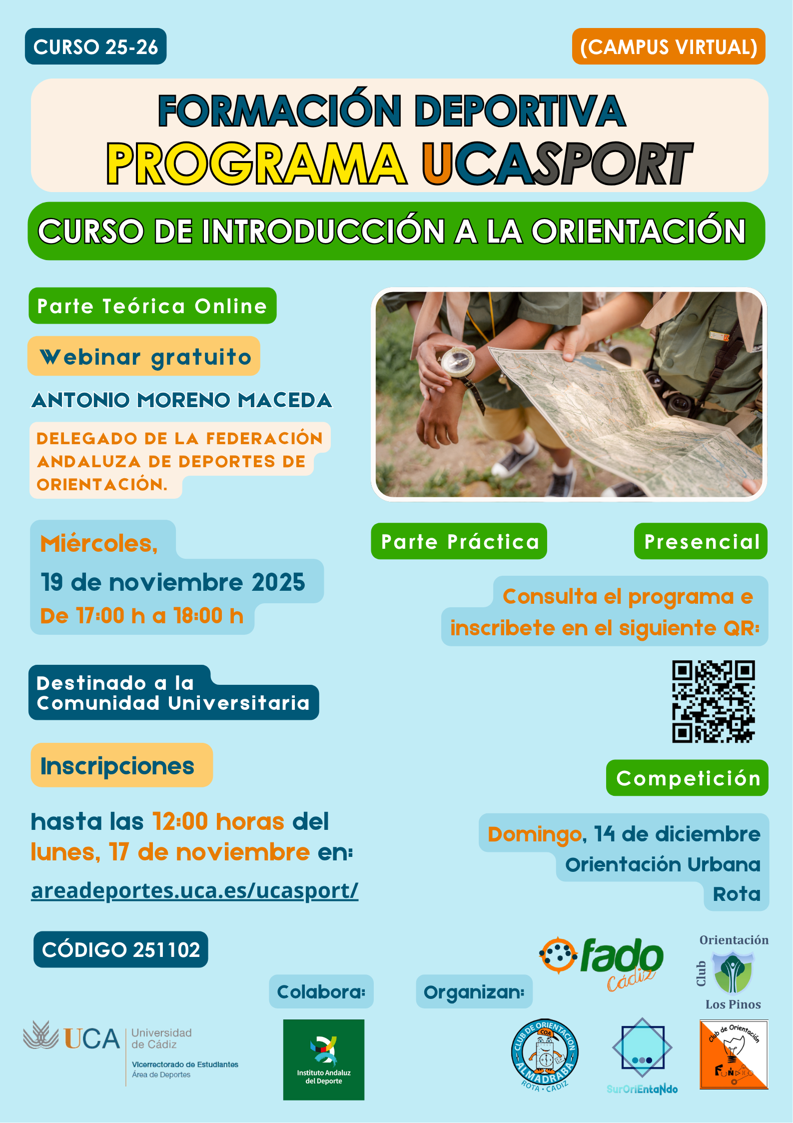 WEBINAR “Introducción al Deporte Orientación”Impartido por Carlos Otero Ramírez, medallista UCA Campeonato de España UniversitarioPlazo de inscripción: Hasta las 12:00 horas del jueves 28 de noviembre de 2024Modelo funcionamiento UCASPORT Documento adicional explicativo