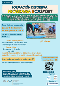 XIII Curso UCASport Surf y Diversidad FuncionalPlazo de inscripción: Hasta las 14:00 h del martes 10 de diciembre de 2024 |
